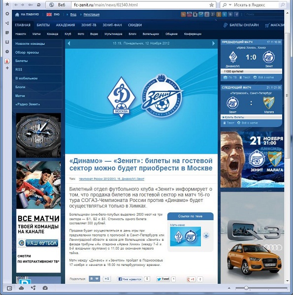 2) ФК «Динамо» пошел навстречу гостям, выделив запрашиваемую квоту, которая превышала установленную регламентом 10-процентную квоту. Одновременно билетному отделу клуба «Зенит» было предложено распространить все выделенные билеты собственными силами по собственному усмотрению. Был получен отказ.3) С учетом этого, в соответствии с достигнутыми ранее договоренностями и с соблюдением установленной процедуры, билеты в гостевые сектора (трибуна В) реализовывались через кассы стадиона «Арена Химки» по предъявлению паспорта с пропиской Санкт-Петербурга или Ленинградской области, что было согласовано с ФК «Зенит». Официальная информация о продаже билетов на гостевую трибуну была размещена на официальном сайте ФК «Зенит» вплоть до сегодняшнего дня. (см. Приложение 2)
