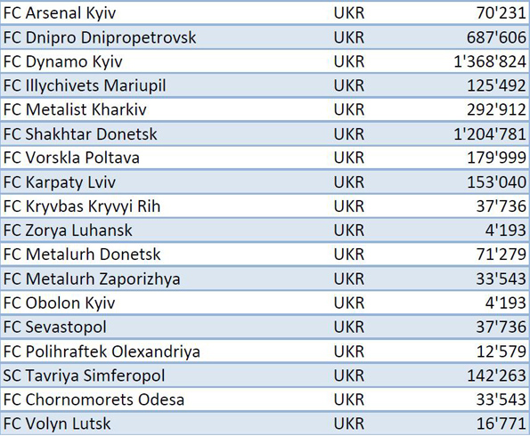 Среди украинских команд больше всего заработало киевское «Динамо» - 1.368.824 евро. После киевского клуба идет «Шахтер» с 1.204.781 евро. Третье место занял «Днепр» с суммой в 687.606 евро. Полный список доходов украинских клубов выглядит таким образом: